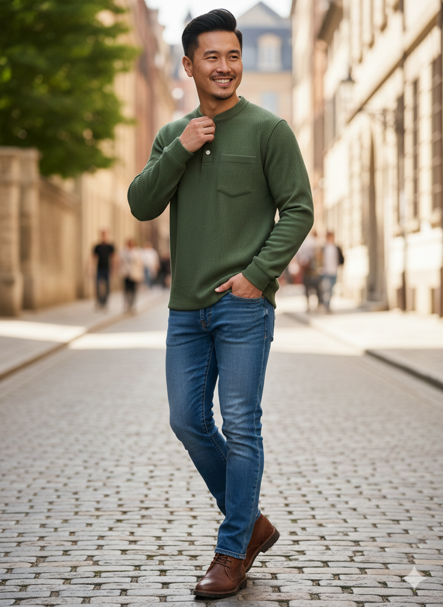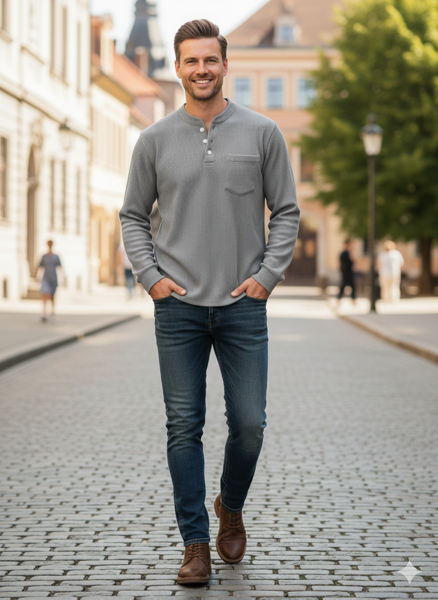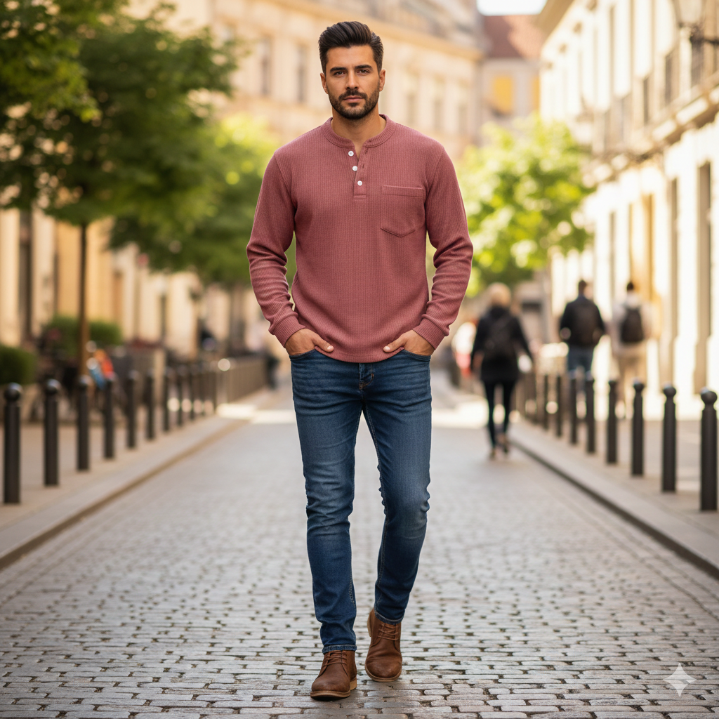 Camisa Polo de Pana con Cuello Henry y Tres Botones - Manga Larga y Estilo Vintage